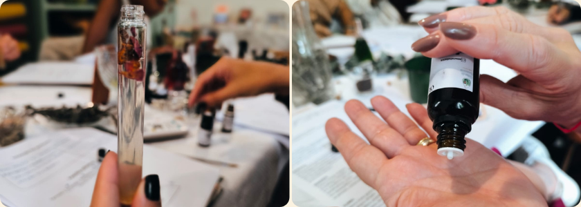 Nossas alunas aprendem a criar seus próprios perfumes botânicos com óleos essenciais, tinturas e extratos naturais, manipulando os ingredientes vegetais e suas propriedades aromaterapêuticas.